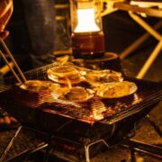 BBQコンロ、焼き網、炭、着火剤、軍手、火バサミ、紙皿、紙コップ、割り箸、タープ